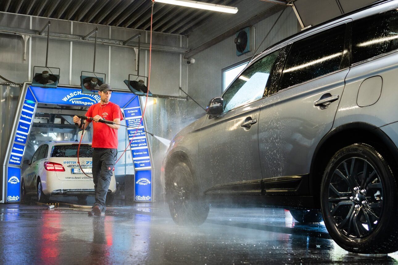 Um ein optimales Ergebnis zu erhalten wird jedes Fahrzeug mit schmutzlösendem Reinigungsmittel eingesprüht, mit Warmwasser und Hochdruck vorgewaschen.
